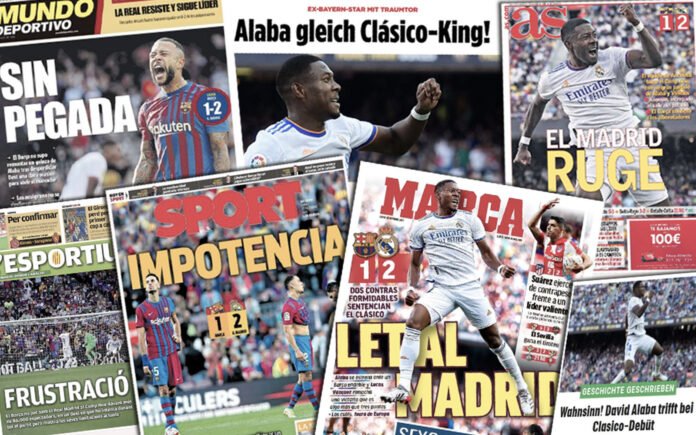 AS (Madrid): “Real Madrid brüllt! Das Team von Ancelotti nimmt das Camp Nou mit einem großartigen Spiel von Alaba und Vinícius ein. Vinícius quälte Barça. Ansu Fati, Memphis Depay und Frenkie de Jong agierten sehr diskret.”